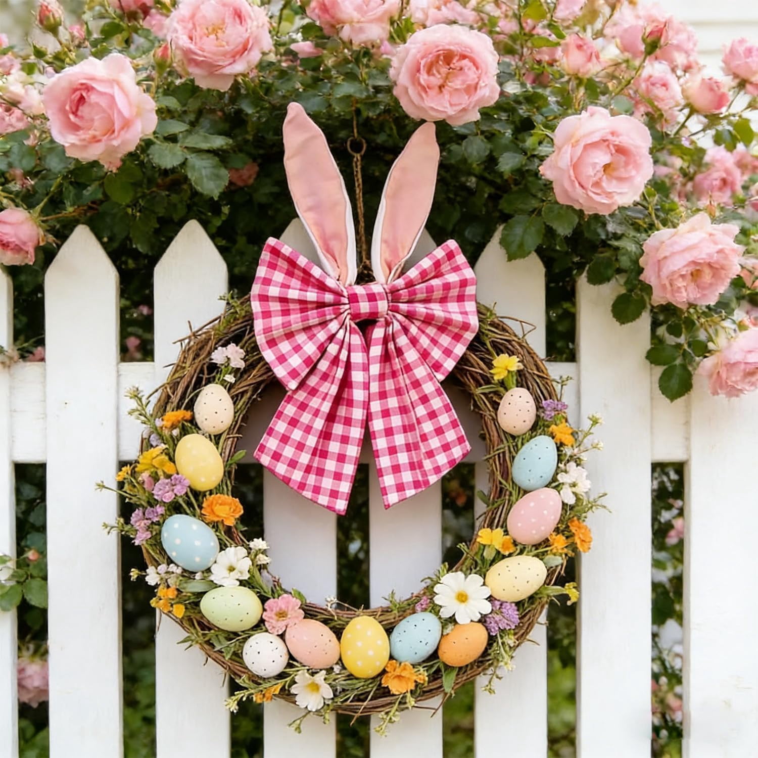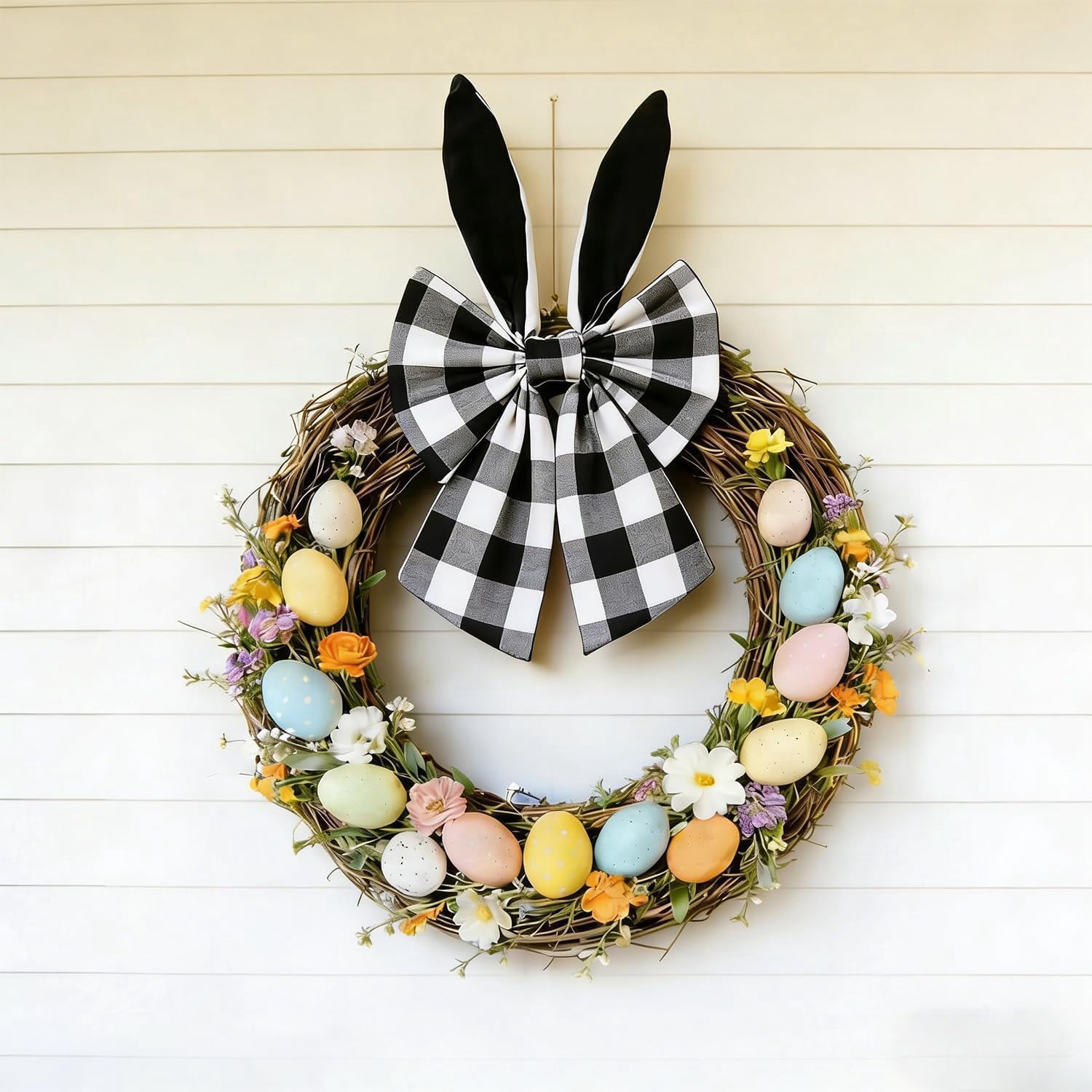 🎁【Perfect for Easter】Ideal for Easter parties and spring weddings. This farmhouse plaid bow creates a warm, joyful atmosphere for any celebration. 🎁【Cute Bunny Design】Features adorable bunny ears in vibrant colors. Adds a playful, eye-catching pop to wreaths, front doors, or festive trees. 🎁【Large & Easy to Hang】Full-sized for strong visual impact yet lightweight. Easily hangs on porches, mantels, or railings for instant holiday charm. 🎁【Durable & Reusable】Made from high-quality fade-resistant fabric. This durable bow holds its shape, making it a perfect reusable decor for years. 🎁【Indoor & Outdoor】Versatile decor for walls, windows, or garden fences. Perfect for porches and tables to create a comprehensive festive atmosphere.