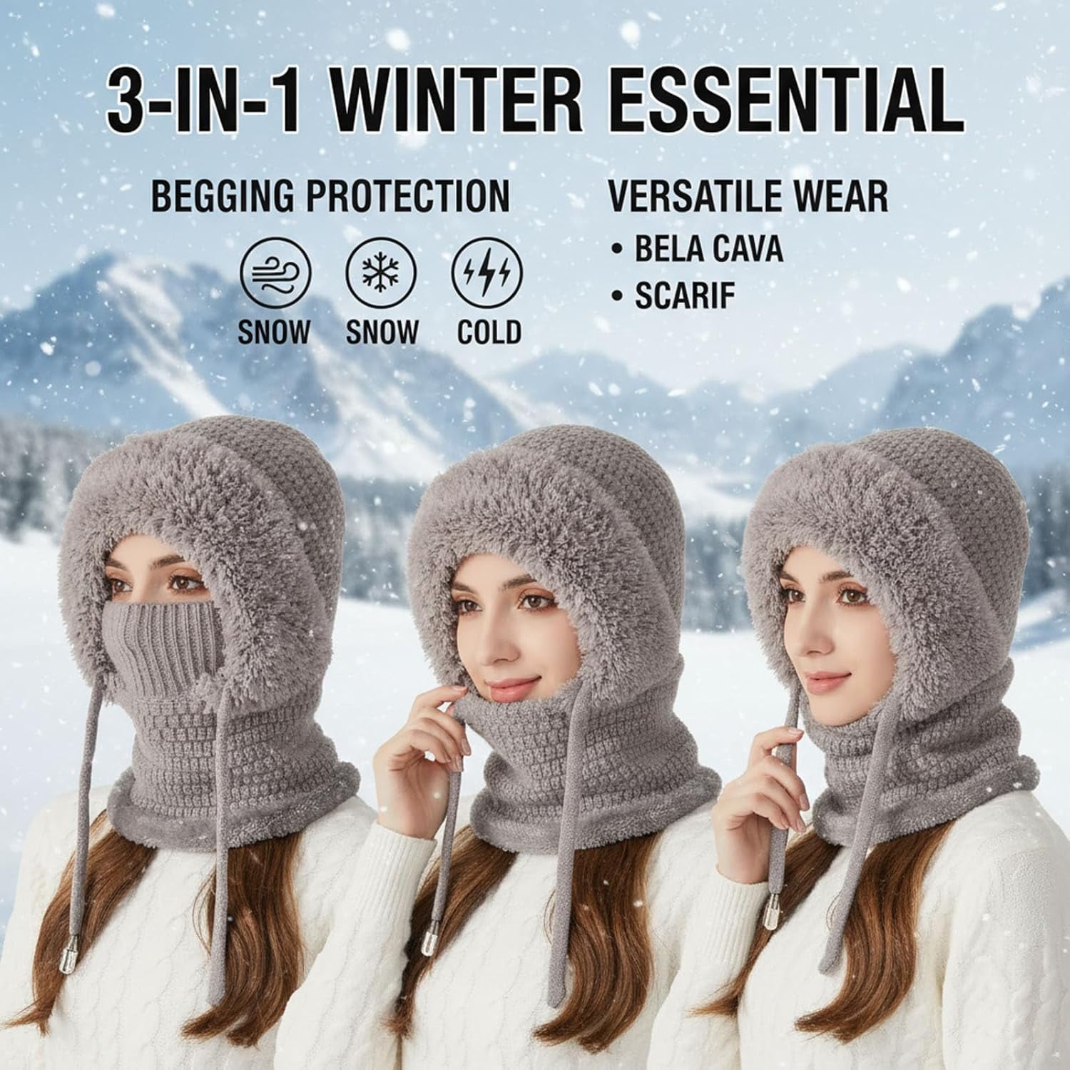 3 in 1 Beanie Hat with Scarf and Mask | Women’s Winter One-Piece Knitted Balaclava, for Cold Weather