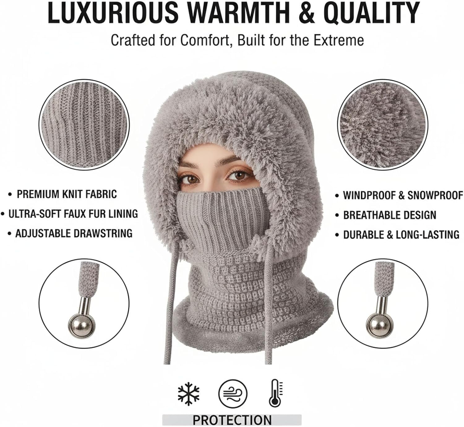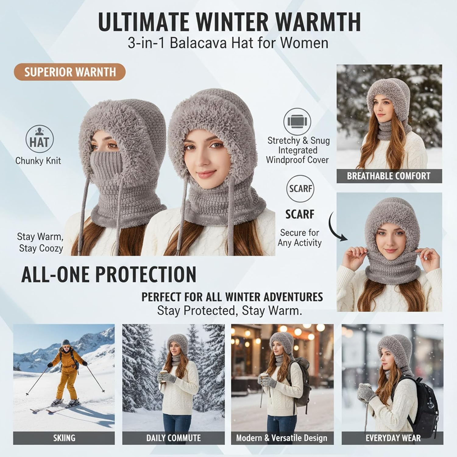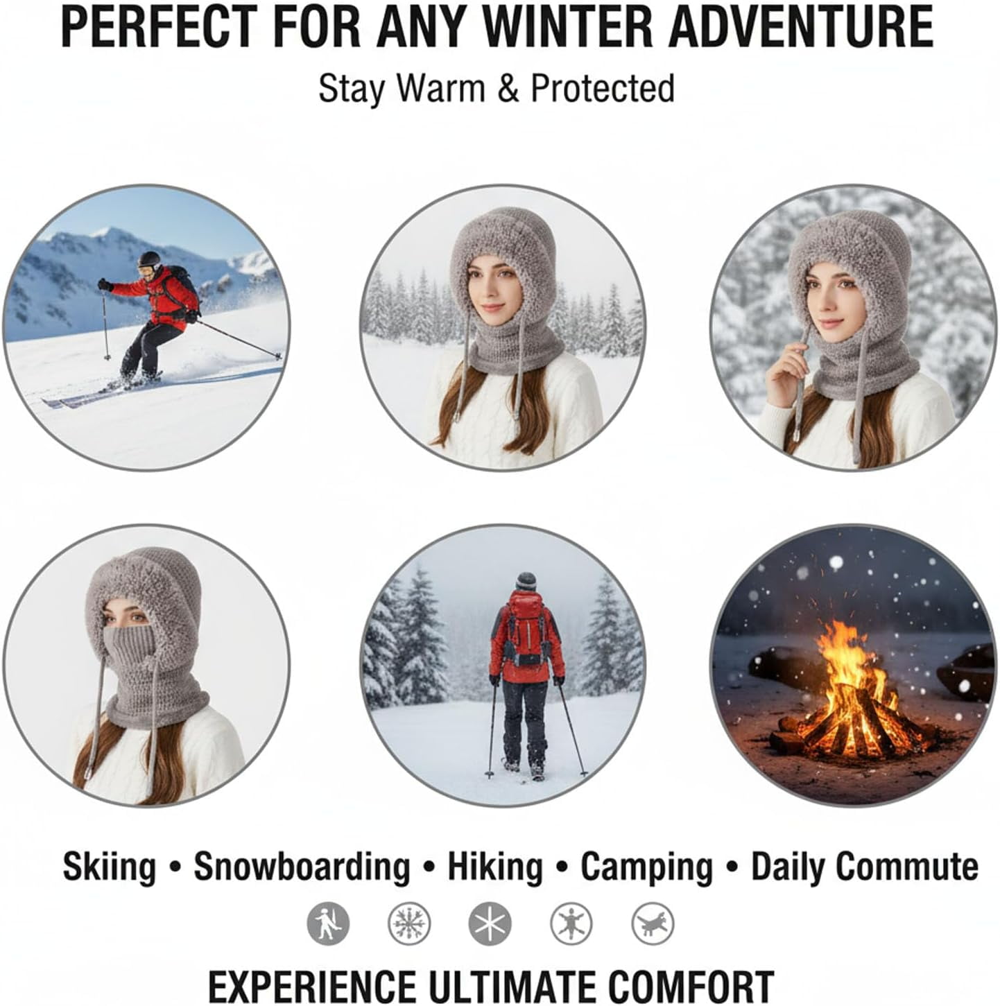 🎁【3-in-1 Multifunctional Design】This one-piece balaclava combines a beanie, a face mask, and a scarf into a single garment, providing full head, neck, and face coverage for all-around winter protection. 🎁【Warm & Breathable Knit Fabric】Crafted from soft, chunky-knit yarn, it delivers excellent insulation against wind and cold while remaining breathable for comfort during extended outdoor wear. 🎁【Adjustable & Secure Fit】Featuring an elastic knit construction that conforms comfortably to different head sizes, ensuring a snug and secure fit that stays in place during activities. 🎁【Stylish Winter Accessory】Offers a modern, fashionable look with its textured knit pattern, seamlessly complementing various winter outfits while providing practical warmth. 🎁【Ideal for Outdoor Activities】Perfect for winter sports like skiing, hiking, or for daily commuting and errands, keeping you warm and protected in diverse cold-weather conditions.