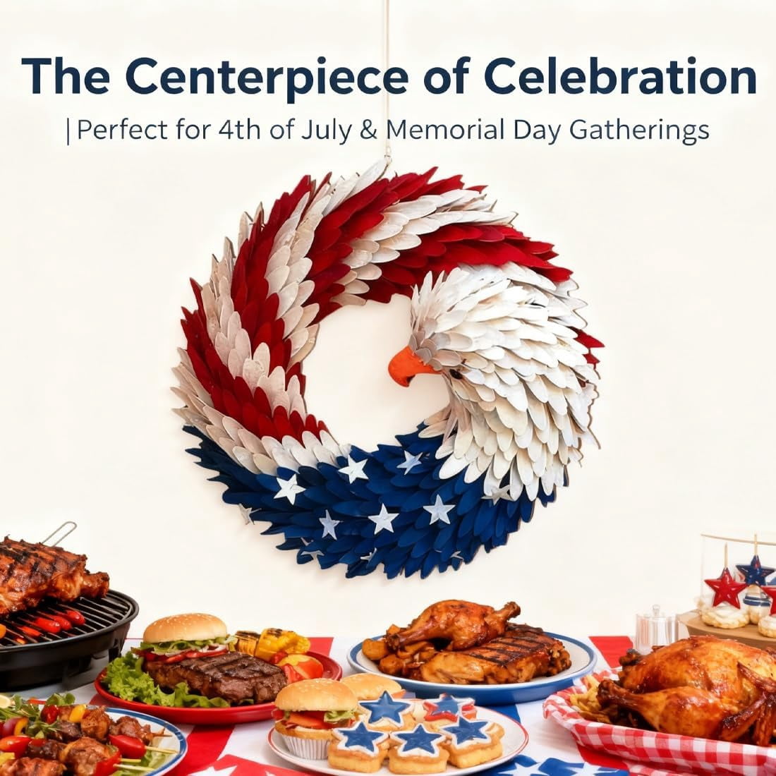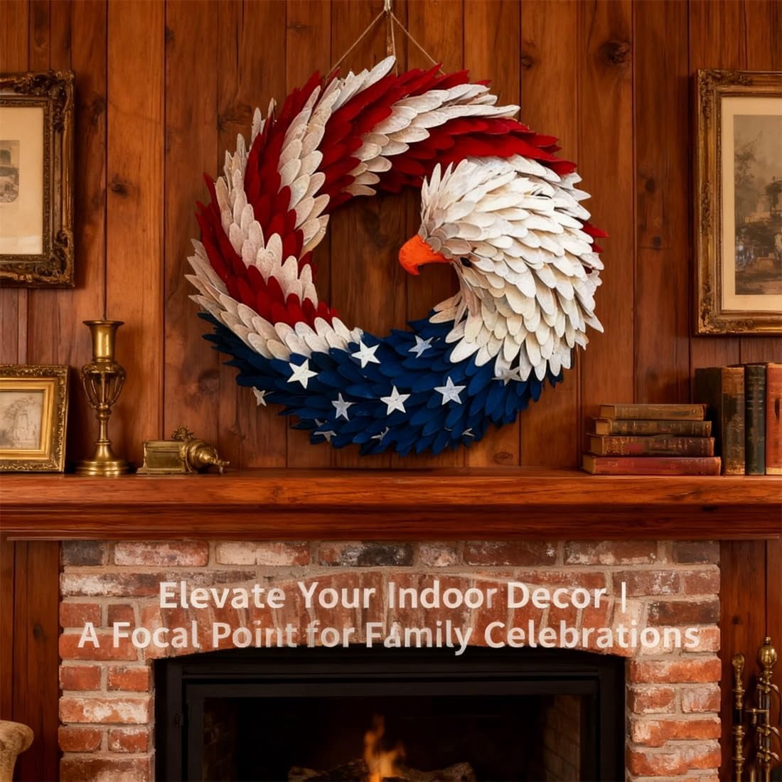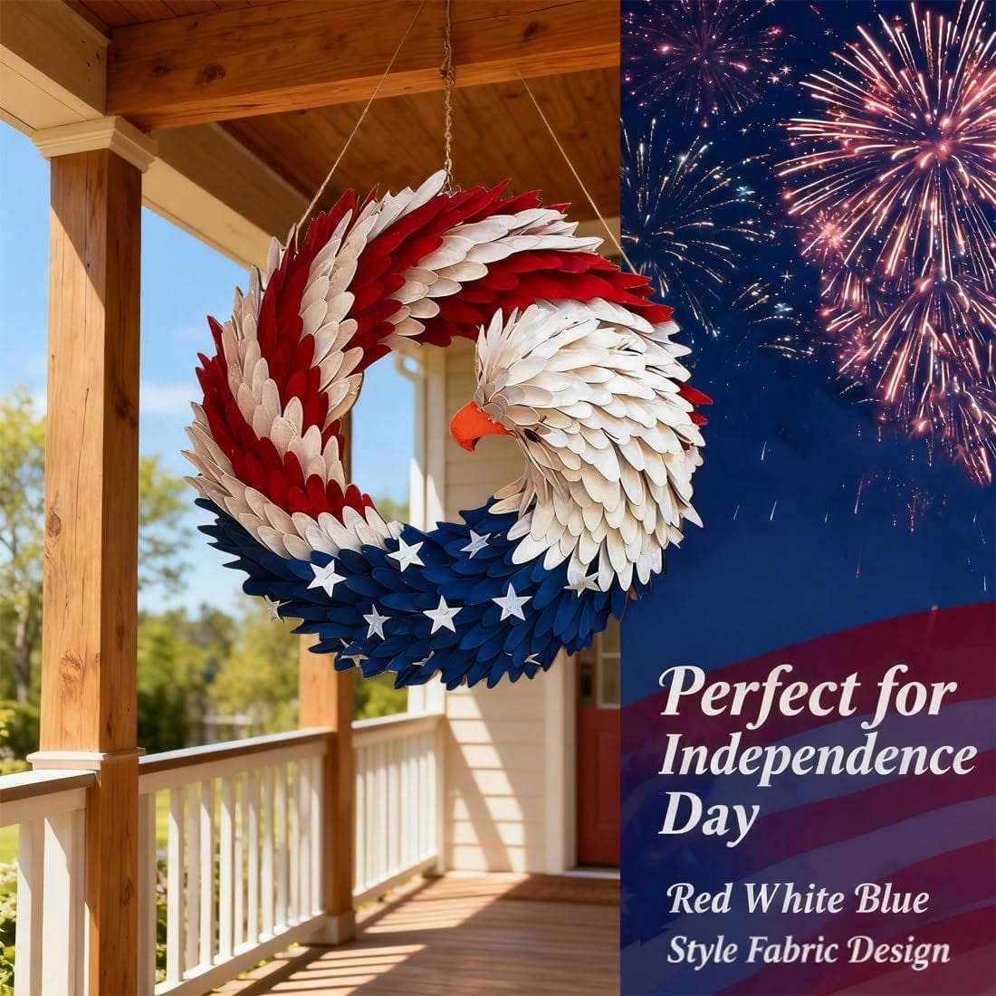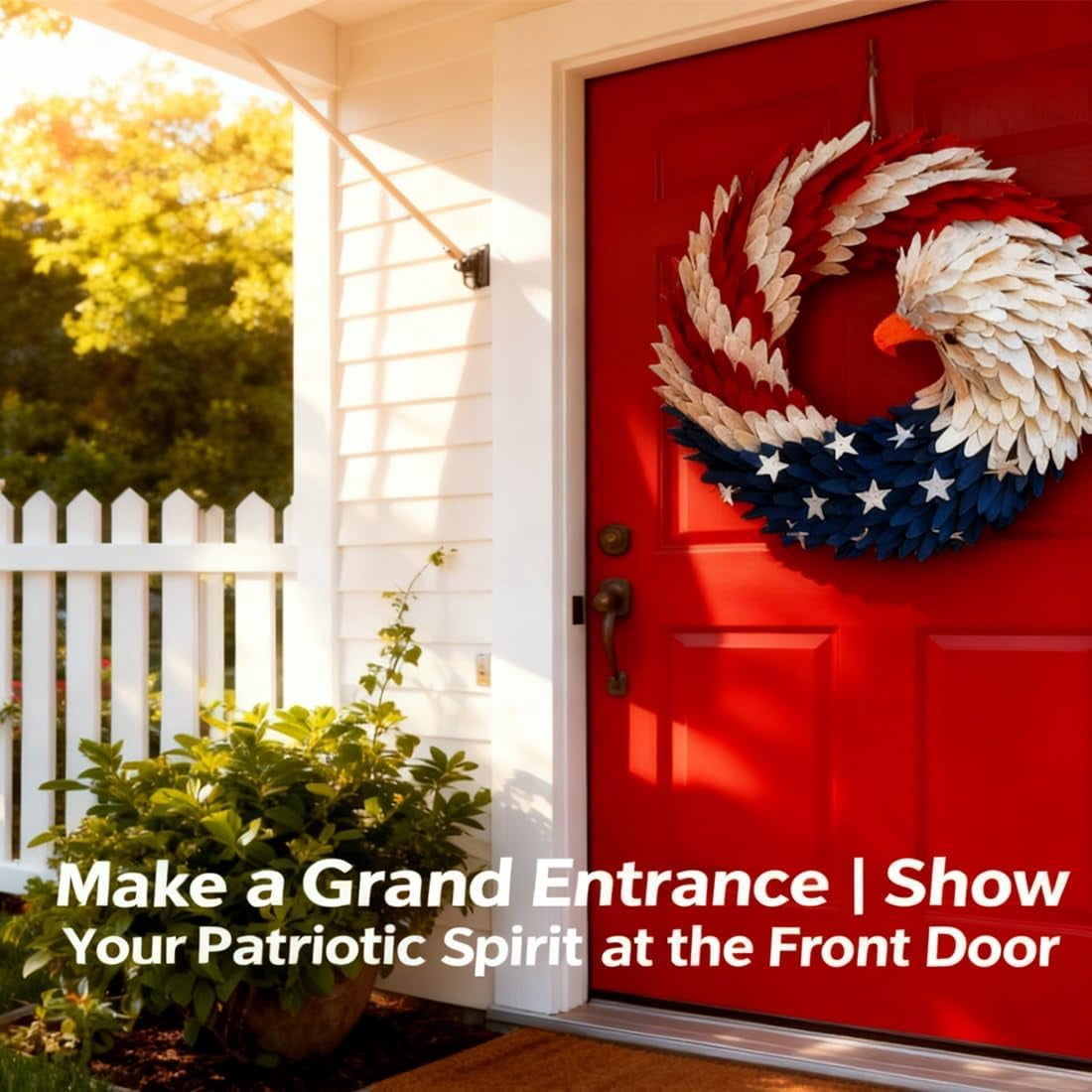 🎁【Patriotic Pride】Show your American spirit with this handcrafted eagle wreath. Bold red, white, and blue colors are perfect for July 4th and Memorial Day. 🎁【Weather Resistant】Built with high-quality materials to withstand the elements. Vibrant colors stay bright year-round, perfect for outdoor porch display. 🎁【Stunning Design】Features a majestic eagle with American flag accents. Crafted from durable wood, this unique piece creates a bold statement on any door. 🎁【Versatile Decor】Ideal for front doors, walls, or fences. A standout decoration for Labor Day, Veterans Day, or everyday patriotic displays at home. 🎁【Perfect Gift】A thoughtful gift for veterans and housewarmings. This impressive design embodies national pride, making it a cherished keepsake for years.