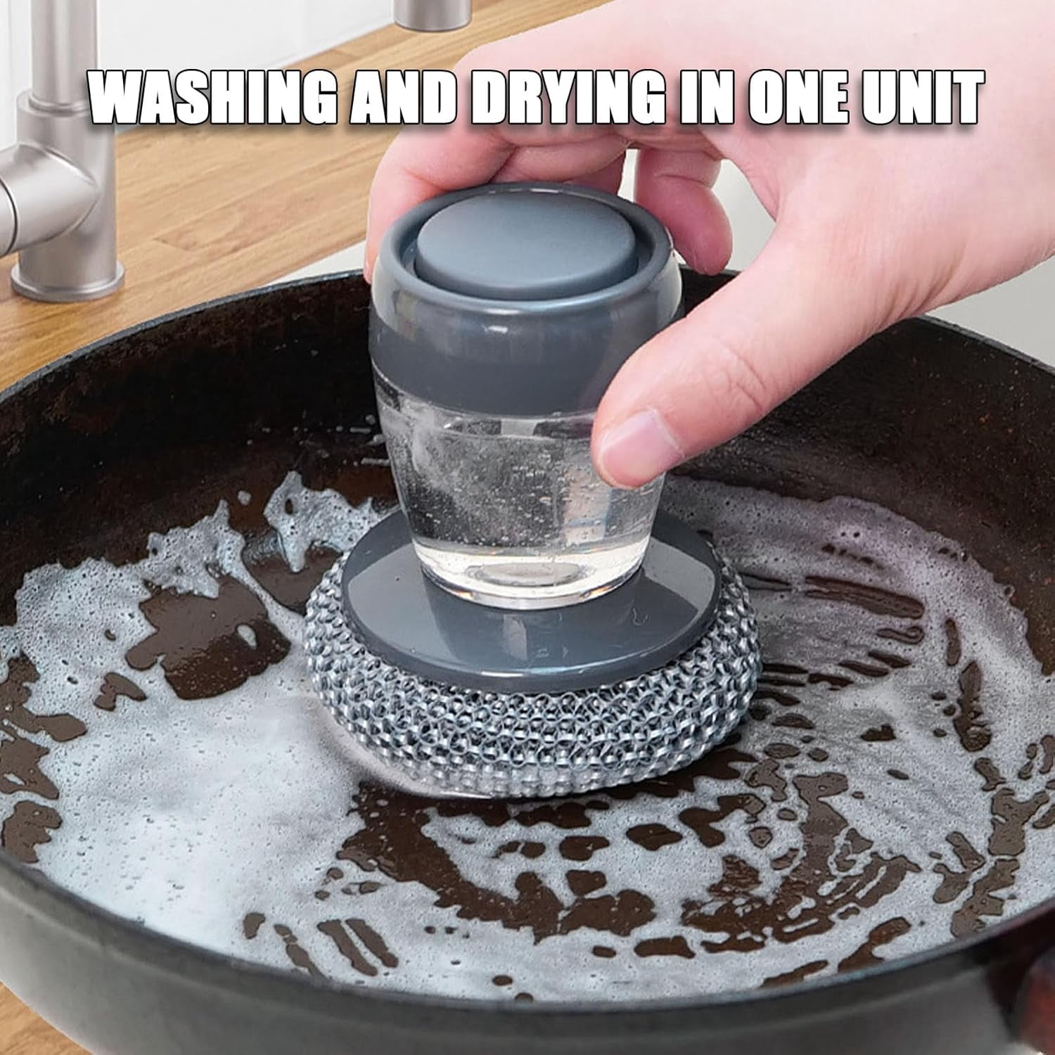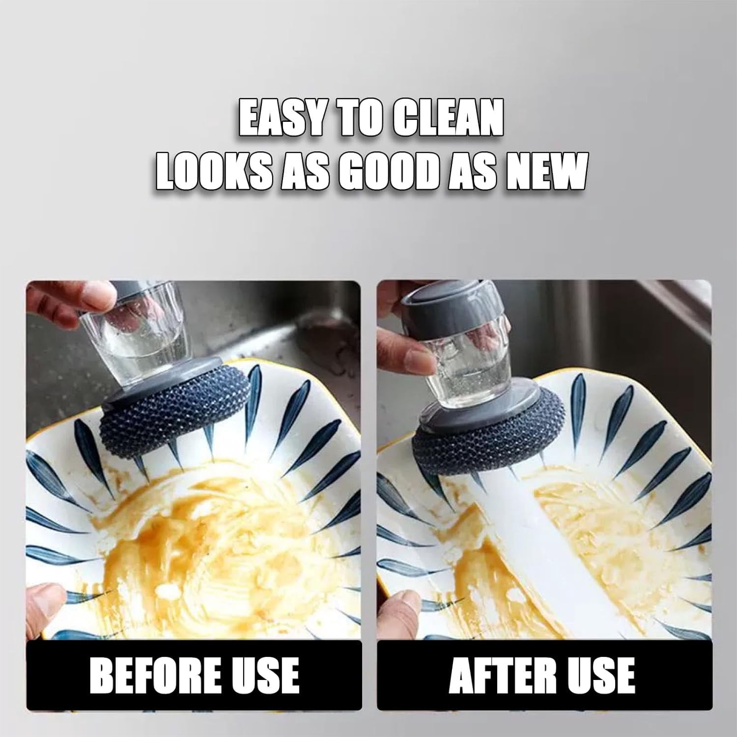✨【Soap Dispensing Handle】Built-in reservoir dispenses soap with a button press. Allows easy one-handed cleaning without reaching for the bottle constantly. ✨【Ergonomic Comfort】Non-slip handle ensures a secure grip even when wet. Reduces hand fatigue, making heavy-duty dishwashing easy and comfortable. ✨【Replaceable Design】Durable brush head is easily replaced when worn. Extends the tool’s lifespan and ensures peak scrubbing performance for years. ✨【Includes 4 Scrubbers】Comes with 4 extra cleaning balls for added value. Provides heavy-duty scrubbing power to tackle tough, baked-on food stains. ✨【Versatile Cleaning】Perfect for scrubbing dishes, cast iron pans, and sinks. This essential tool makes daily kitchen cleanup quick and effortless.