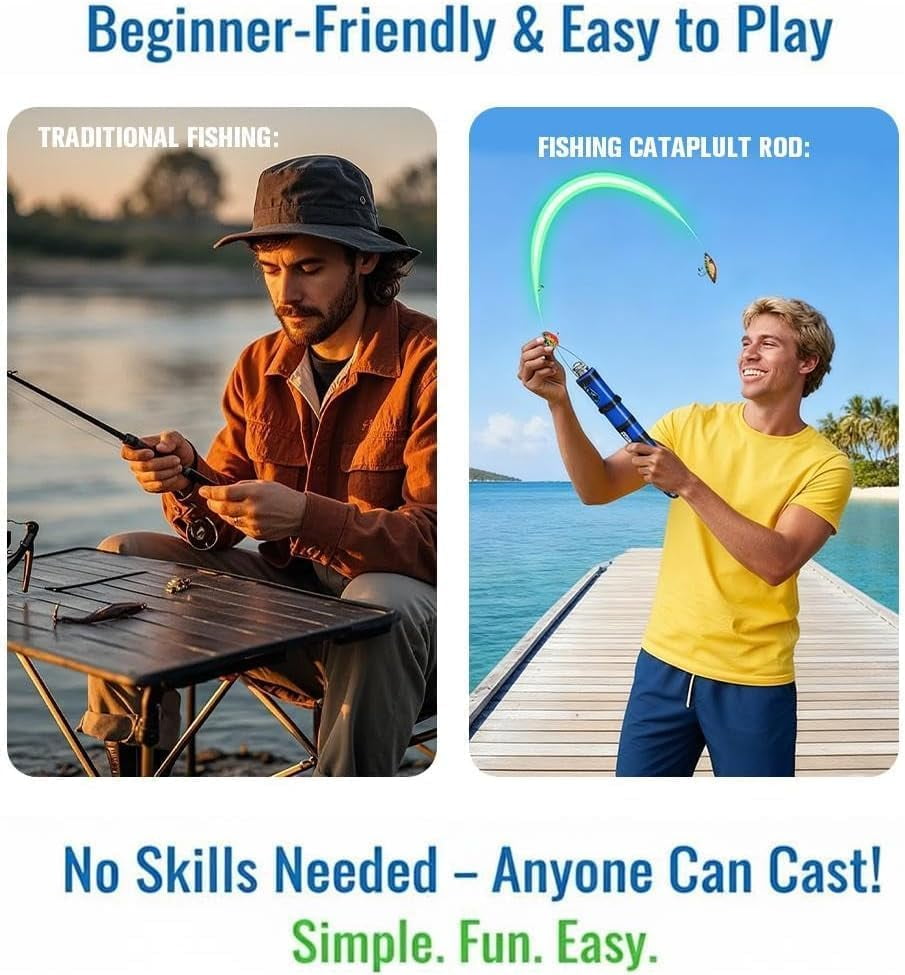 🎁【Compact & Telescopic Design】This fishing catapult rod features a collapsible design for ultimate portability. It extends for use and retracts for easy storage in backpacks, ideal for travel, hiking, or spontaneous fishing trips. 🎁【Easy to Use for All Ages】Simple 3-step operation (load, aim, launch) makes it perfect for beginners, kids, and experienced anglers. Achieve accurate, longer casts with minimal effort, enhancing fun for the whole family. 🎁【Dual-Purpose Bait & Lure Launcher】Functions as both a standard fishing rod and an effective catapult. Launch bait to attract fish or cast lures to distant spots, significantly reducing wait time and increasing your catch rate. 🎁【Durable ABS & Metal Construction】Built with a sturdy ABS body and reinforced metal components to withstand repeated use. It includes a strong fishing line, ensuring reliability during your outdoor fishing adventures. 🎁【Versatile for Multiple Fishing Styles】Adaptable for various environments including lakes, rivers, shores, and ice fishing. A great tool for shore casting, bait fishing, or as a unique gift for fishing enthusiasts.
