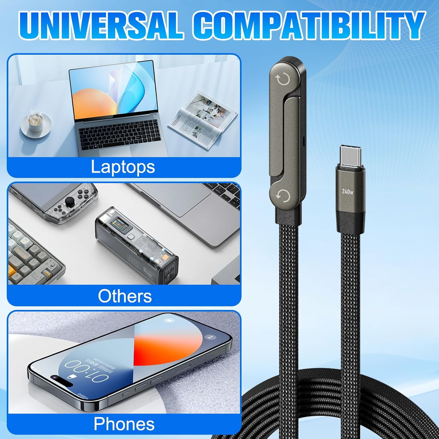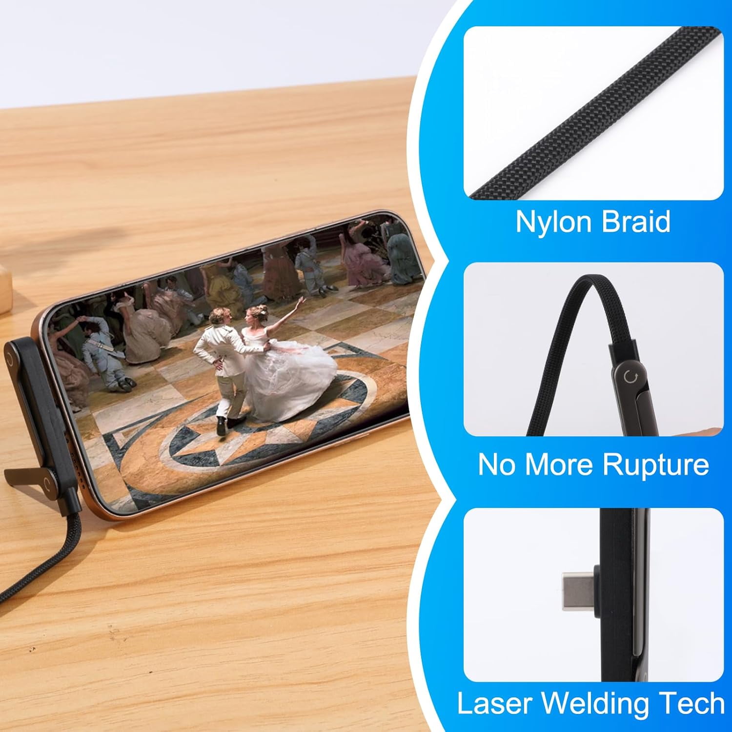 🎁【240W Fast Charge】Delivers max 240W output for rapid powering of laptops and phones. Ensures high-speed, stable energy transfer for all USB-C devices. 🎁【90° Gaming Design】Ergonomic elbow connector fits comfortably in hand. Reduces cable bending and port strain, perfect for gaming or using phone while charging. 🎁【Built-in Phone Stand】Features a hidden pop-out bracket for hands-free viewing. Perfect for watching videos or calls while charging, no extra stand needed. 🎁【Durable Braided Wire】Tightly woven nylon braid resists fraying and wear. Built to withstand daily bending and heavy use for long-lasting reliability. 🎁【Portable & Tidy】Compact design minimizes clutter on desks or nightstands. Lightweight and flexible, it is perfect for travel and keeping spaces organized.