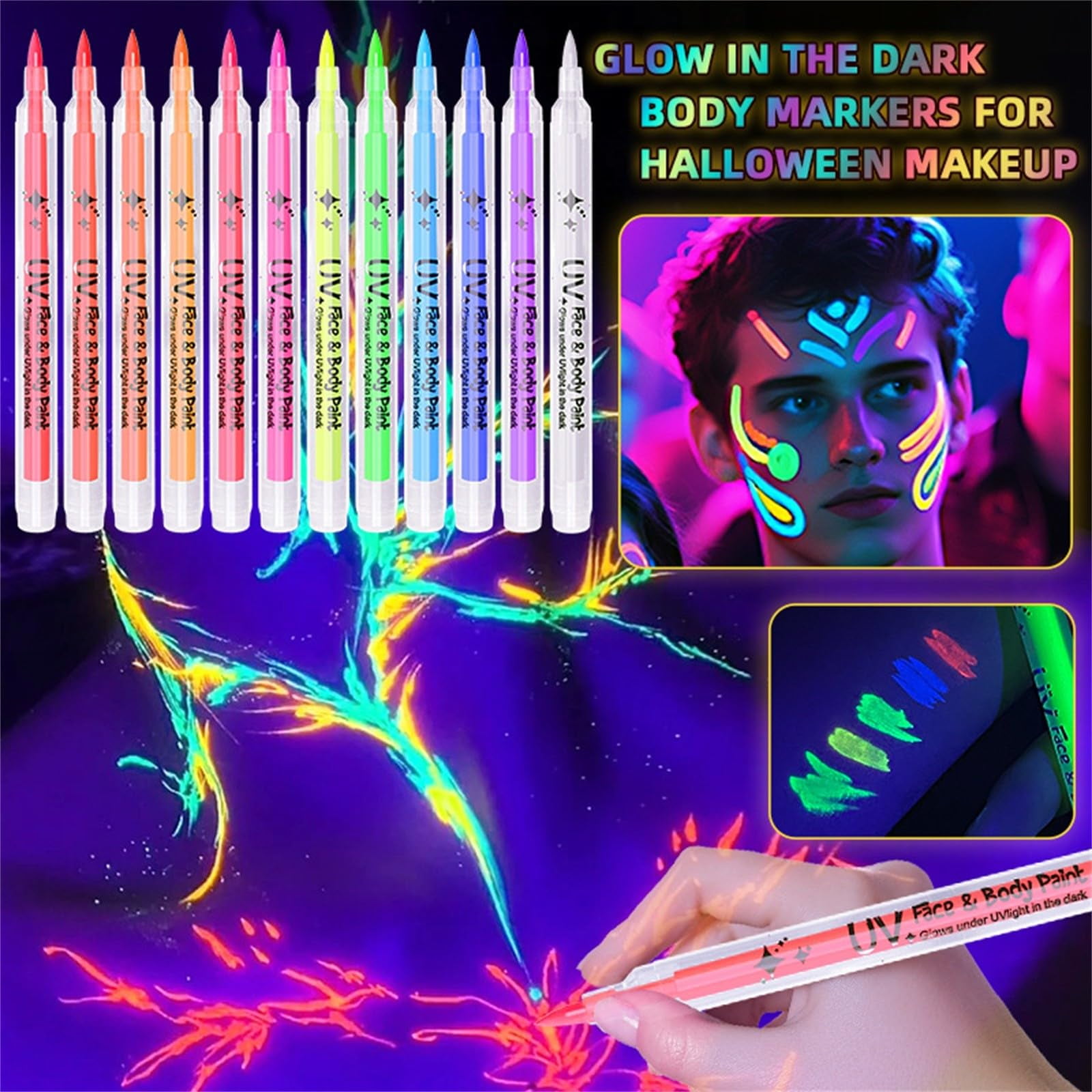 🎁【UV Reactive Neon Colors】Includes 12 bright neon shades that glow vividly under UV or black light, creating eye-catching fluorescent effects for parties and events. 🎁【Easy Application & Portable】Allows precise lines or full coverage without extra tools. Compact size makes it easy to carry for quick touch-ups anywhere. 🎁【Water-Based & Easy to Wash】Made with a gentle, water-based formula that is skin-friendly and easy to remove with water after use, leaving no sticky residue. 🎁【Multi-Scene Creative Makeup】Ideal for Halloween, cosplay, music festivals, parties, and DIY temporary fluorescent body or face art designs. 🎁【Long-Lasting Color Finish】Delivers even, high color payoff that sets well and resists smudging, making it suitable for stage makeup and festive looks.