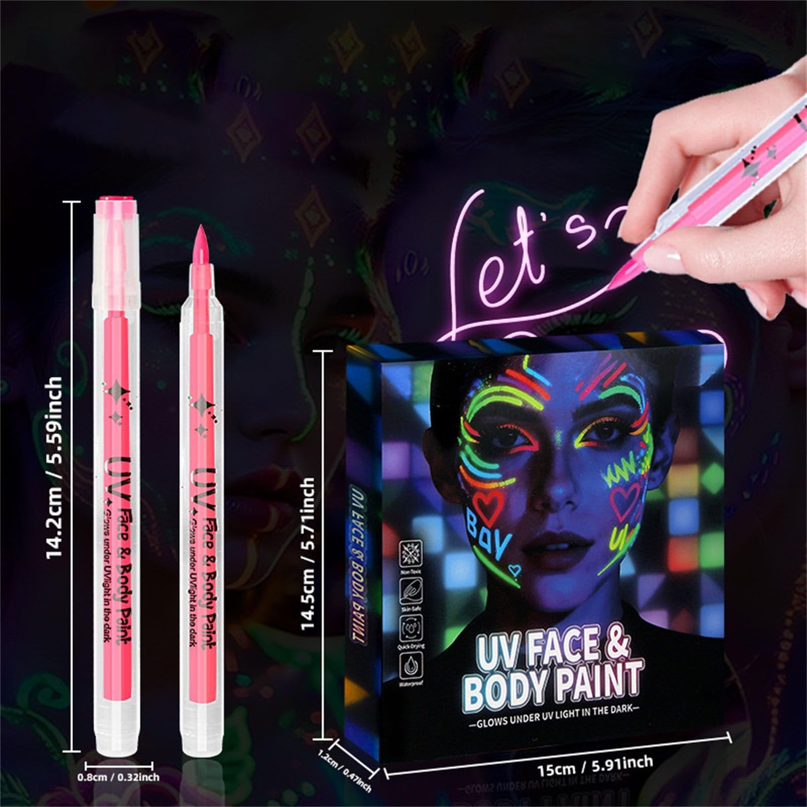 🎁——————————-Welcome to our shop—————————–🎁 If you have any questions, please contact us immediately. Welcome to my treasure trove of a shop! You’re sure to find what you need here! Thank you for your patronage! Have a wonderful day! Features: 1.12 UV reactive neon colors 2.Water-based, easy to wash 3.Portable and easy to apply 4.For cosplay and festivals 5.Long-lasting vivid finish Specifications: Name: Glow Face and Body Paint Markers Set Glow Effect: UV / Blacklight Reactive Only (Does not self-glow in the dark) Colors: 12/8 Vibrant Neon Colors Formula: Water-proof, Sweat-proof, Long-Lasting Cleanup: Easy removal with soapy water or makeup wip Package: 1 PCS * Glow Face and Body Paint Markers Set Note: 1. Due to manual measurement, please allow a difference of 1-5g/1-2cm. 2. Due to different displays and different lighting, the picture may not reflect the actual color of the item. Thank you for your understanding.