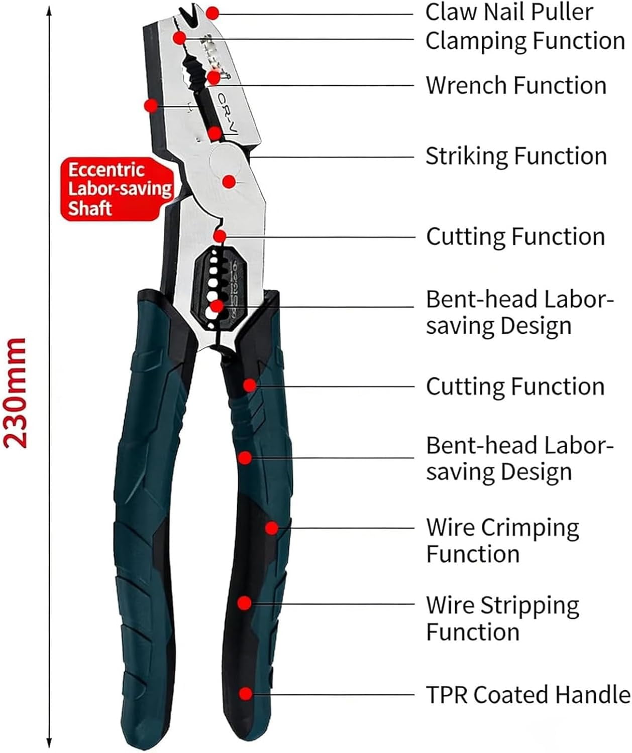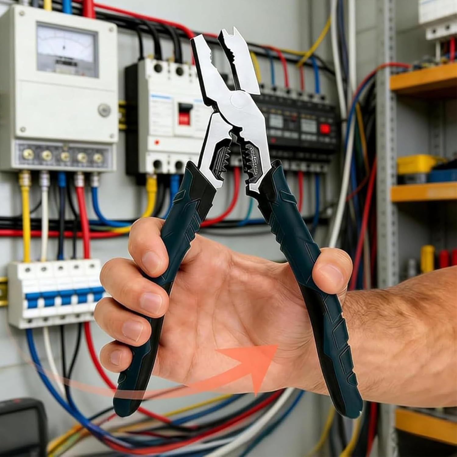 ✨【Versatile Electrician Multitool】10–18 AWG wire stripper cutter combines 9 functions, including cutting, stripping, and crimping, for efficient home and electrical repairs. ✨【Compound Action High Leverage】Advanced compound action design increases gripping and cutting power, enabling smoother cutting and crimping with reduced hand fatigue. ✨【Precise Wire Stripping & Cutting】Designed for accurate stripping and clean cuts on common wire gauges, improving control and consistency during electrical tasks. ✨【Industrial-Grade Construction】Built with durable materials for reliable strength and long-term performance in home repair, renovation, and DIY applications. ✨【Essential Toolbox Addition】Ideal for electricians, DIYers, and homeowners, this multifunction pliers tool supports fixing, wiring, and maintenance with convenience.