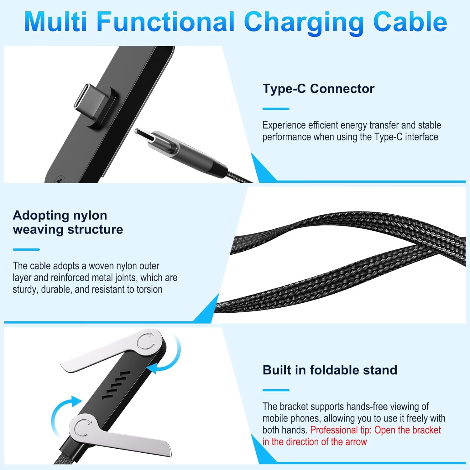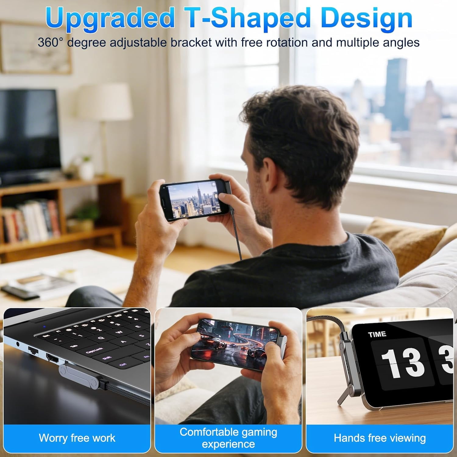 🎁【240W Fast Charge】Delivers max 240W output for rapid powering of laptops and phones. Ensures high-speed, stable energy transfer for all USB-C devices. 🎁【Built-in Phone Stand】Features a hidden pop-out bracket for hands-free viewing. Perfect for watching videos or calls while charging, no extra stand needed. 🎁【90° Gaming Design】Ergonomic elbow connector fits comfortably in hand. Reduces cable bending and port strain, perfect for gaming or using phone while charging. 🎁【Durable Braided Wire】Tightly woven nylon braid resists fraying and wear. Built to withstand daily bending and heavy use for long-lasting reliability. 🎁【Portable & Tidy】Compact design minimizes clutter on desks or nightstands. Lightweight and flexible, it is perfect for travel and keeping spaces organized.