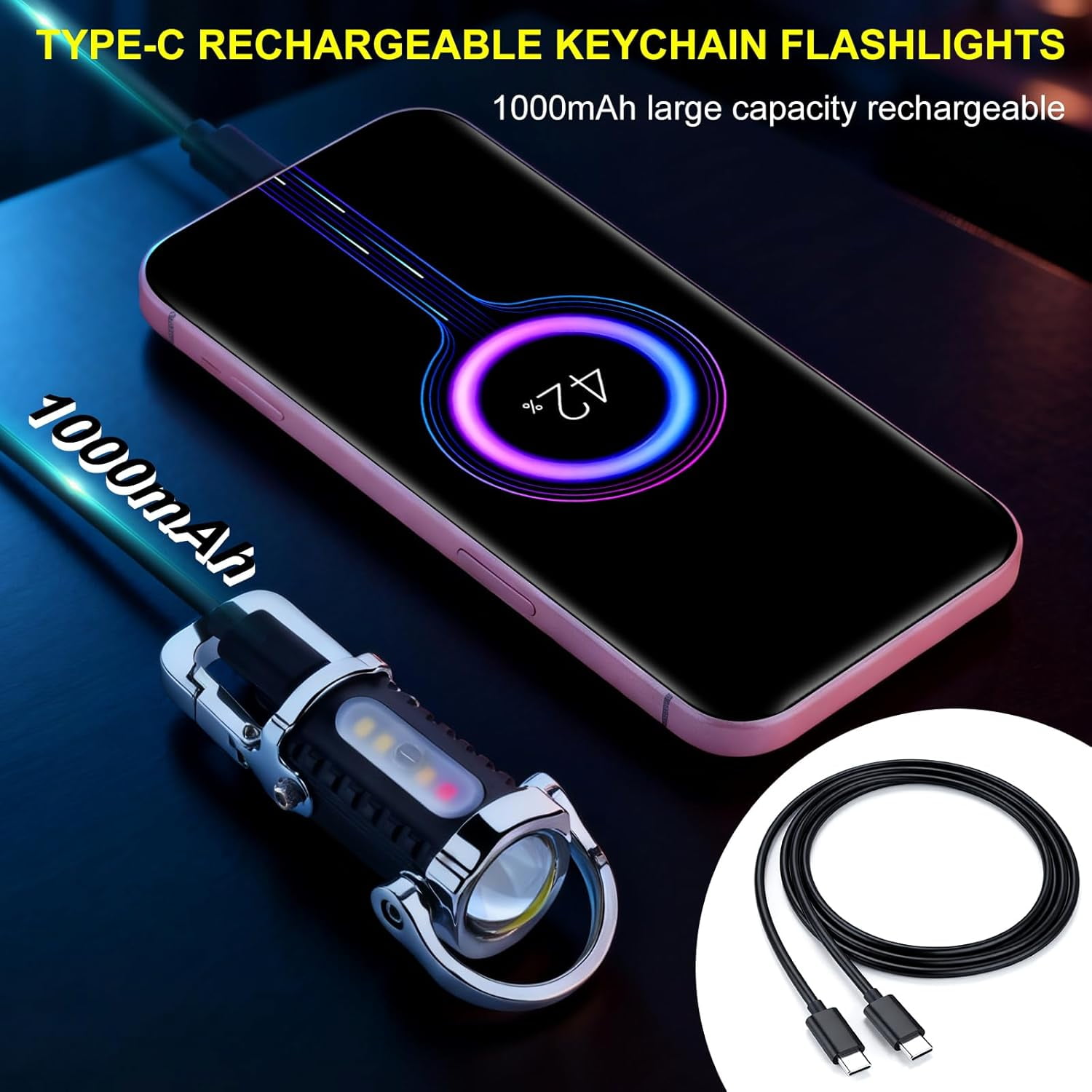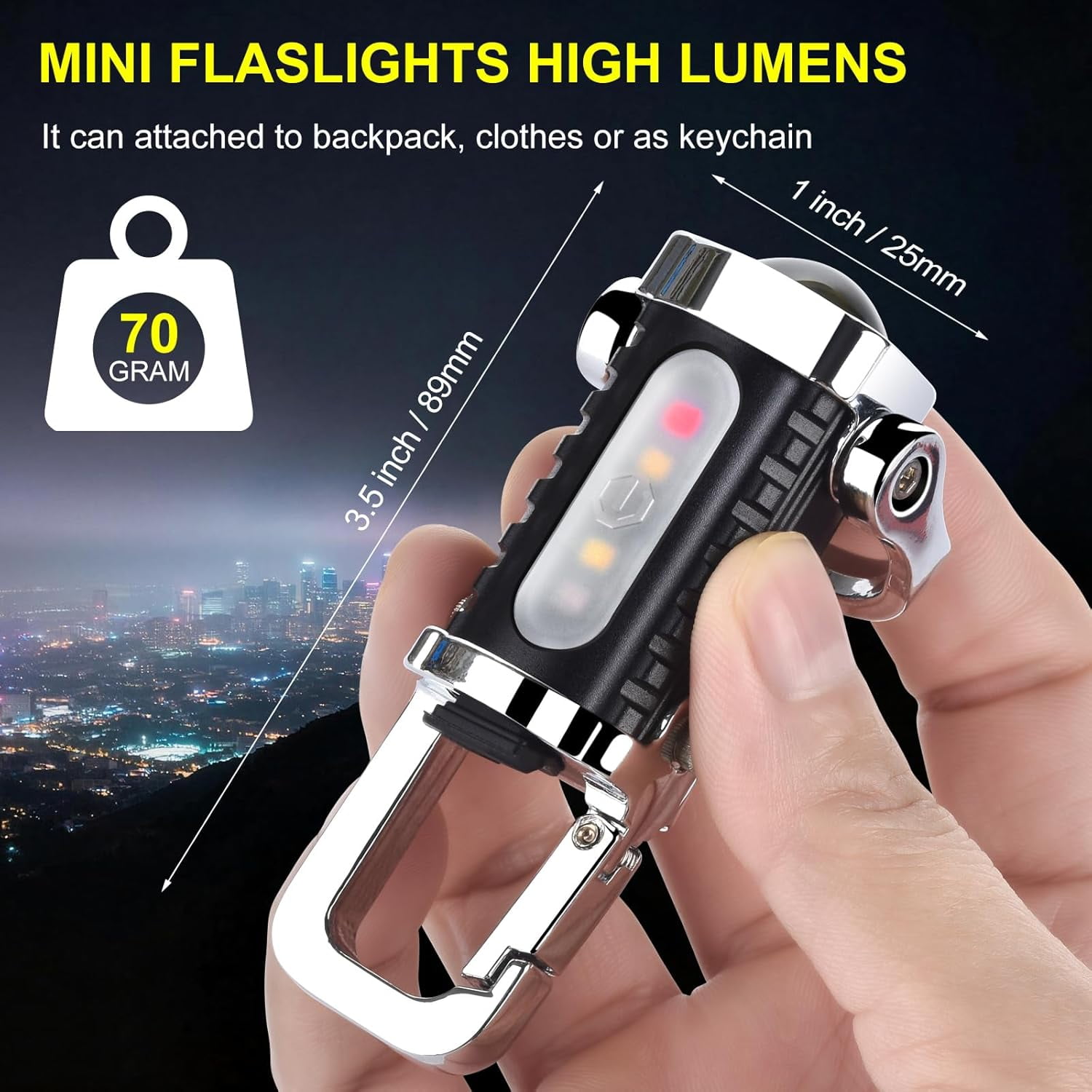 🎁【Ultra-Portable Keychain Ready】Designed for convenience, this keychain flashlight is incredibly lightweight and compact. It effortlessly clips onto your keys, backpack, or belt loop. 🎁【6 Light modes with】this keychain light Tailor the light to your needs with multiple settings. Switch between High for maximum illumination, Low to conserve battery, and a flashing Strobe mode for emergencies or signaling. 🎁【Rechargeable batteries】Powered by a built-in battery that recharges quickly via the included USB Type-C cable. This modern charging solution eliminates the cost and waste of disposable batteries. 🎁【Strong and waterproof】Built to withstand the rigors of daily life and outdoor adventures. Its Sturdy, water-resistant construction ensures reliable performance in rain, snow, or damp conditions. 🎁【Suitable for gifts】This mini keychain flashlight is a wonderful gift for friends and family, and is the best gift choice for families, couples, or anyone who values practical preparedness.