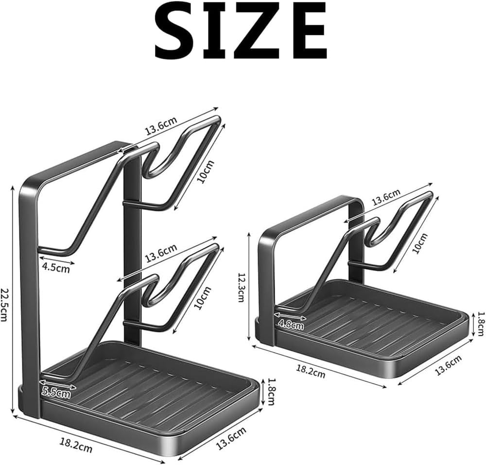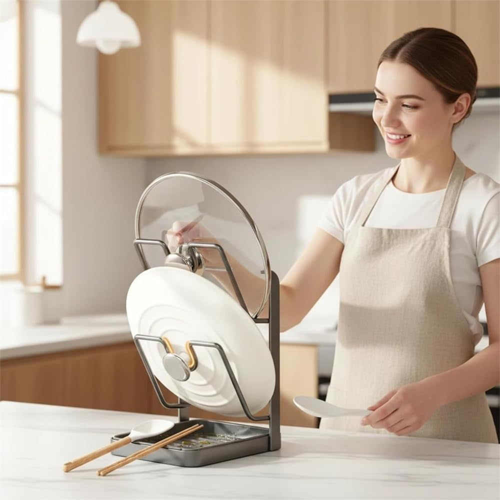 🎁【U-Shaped Slots for Secure Storage】Features specially designed U-shaped slots that securely hold various sizes of pot lids upright and in place. This prevents them from slipping or cluttering your countertop, keeping your kitchen tidy and lids within easy reach while cooking. 🎁【Built-In Removable Drip Tray】Equipped with a slotted base that guides spills and condensation into a detachable drip tray. This tray lifts out easily for quick rinsing, helping to keep your counter or stovetop clean, dry, and free of water stains. 🎁【Multi-Functional Design & Storage】Serves as both a dedicated pot lid holder and a convenient organizer for kitchen utensils. The integrated deep tray can hold spatulas, ladles, and spoons, keeping essential cooking tools neatly contained and accessible. 🎁【Durable & Stable Construction】Built with sturdy, reinforced materials to reliably hold heavy lids (cast iron, glass, stainless steel) without bending. Features a weighted, non-slip base to ensure stability during use on any surface. 🎁【Space-Saving for Any Kitchen】Its compact, vertical design maximizes storage without taking up valuable counter space. Perfect for organizing next to the stove, on the countertop, or in small kitchens, apartments, and RVs.