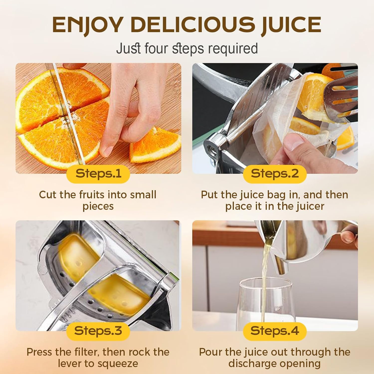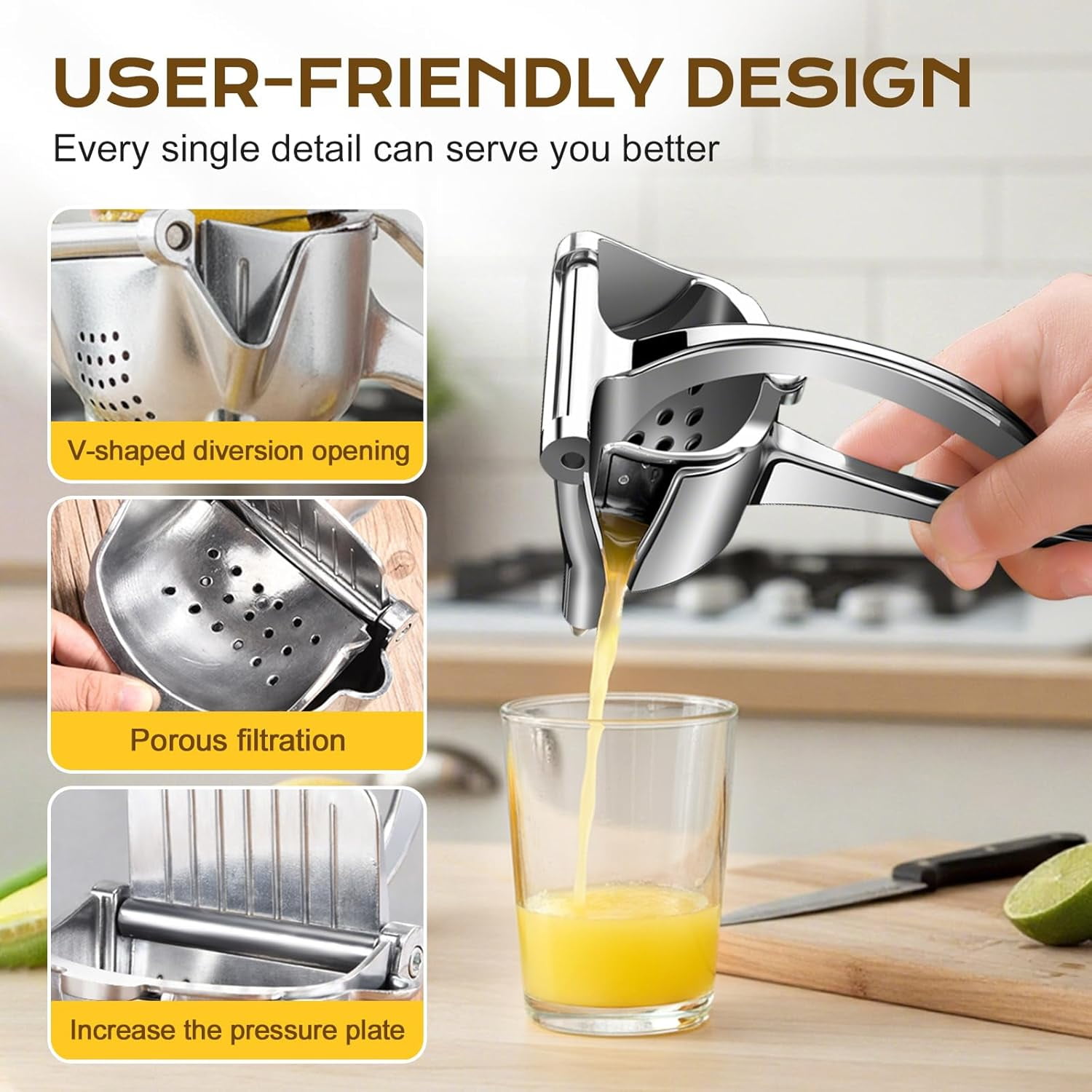 🎁【Ergonomic Comfort Handle】Curved ergonomic grip ensures secure, comfortable use, minimizing hand fatigue while efficiently extracting juice from citrus fruits. 🎁【Multi-Fruit Juicing Versatility】Manual juicer handles lemons, oranges, grapefruits, pomegranates, watermelons, kiwis, and mangoes for fresh juice anytime. 🎁【Precise V-Shaped Spout】V-shaped spout directs juice cleanly, separates seeds and pulp, ensuring smooth, ready-to-drink juice without mess. 🎁【Easy Cleaning Design】Detachable inner cup allows quick hand washing; keeps your manual juicer clean and ready for frequent use. 🎁【Durable Aluminum Alloy Build】Heavy-duty aluminum alloy construction provides long-lasting performance and maintains a classic silver finish for frequent use.