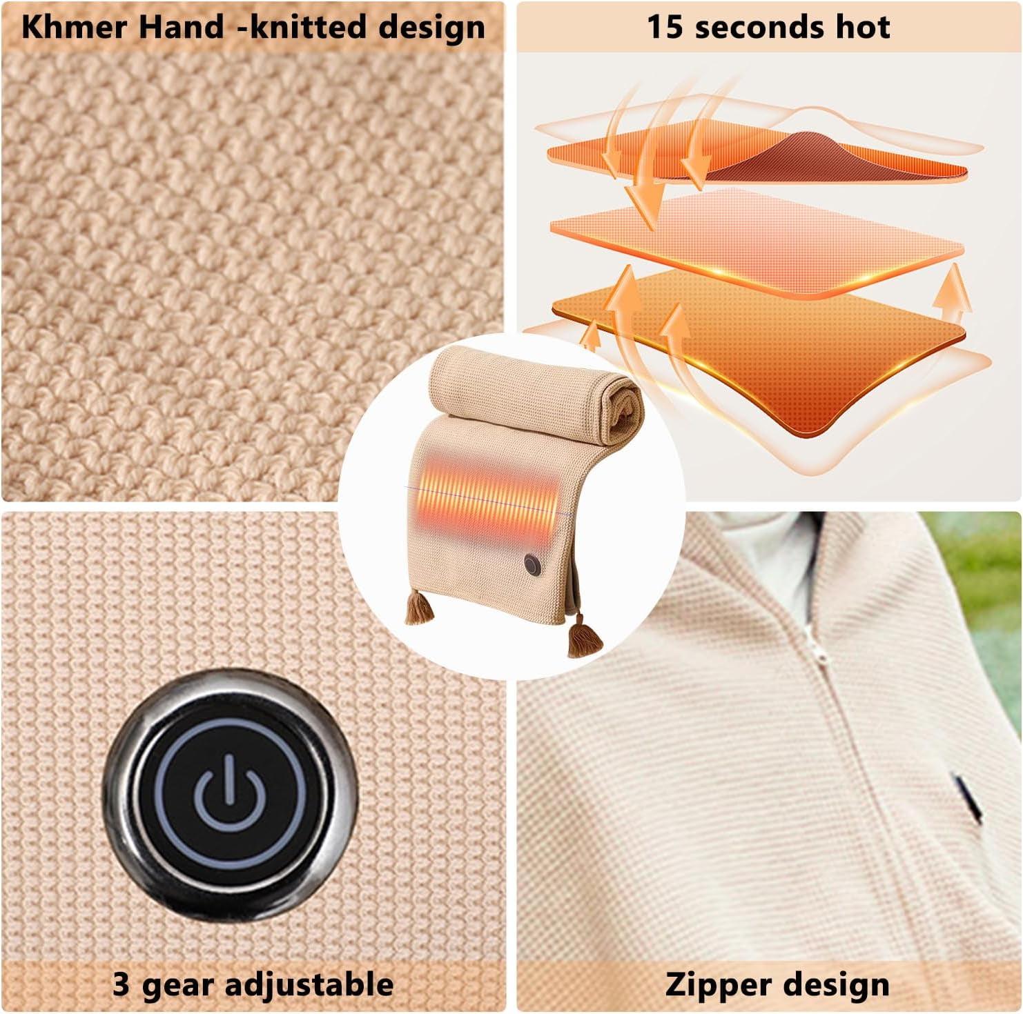 🎁【Rapid Heating Technology】Advanced fiber heating delivers warmth in just 15 seconds, ensuring fast, even heat circulation to protect against cold and keep you comfortably warm. 🎁【Adjustable Temperature Settings】Multiple heat levels let you customize warmth, from gentle relaxation heat to stronger warmth for colder conditions, delivering personalized comfort anytime. 🎁【Ultra-Soft Premium Fabric】Crafted with plush, skin-friendly material, this cordless electric blanket feels soft and cozy while providing consistent, soothing warmth on chilly days or nights. 🎁【Hands-Free Zipper Design】Secure zipper closure keeps the heated shawl in place, allowing hands-free comfort and steady warmth without constant readjustment during use. 🎁【Portable & Lightweight】Lightweight and foldable for easy storage, this wearable heating blanket is ideal for travel, camping, office use, or relaxing at home.
