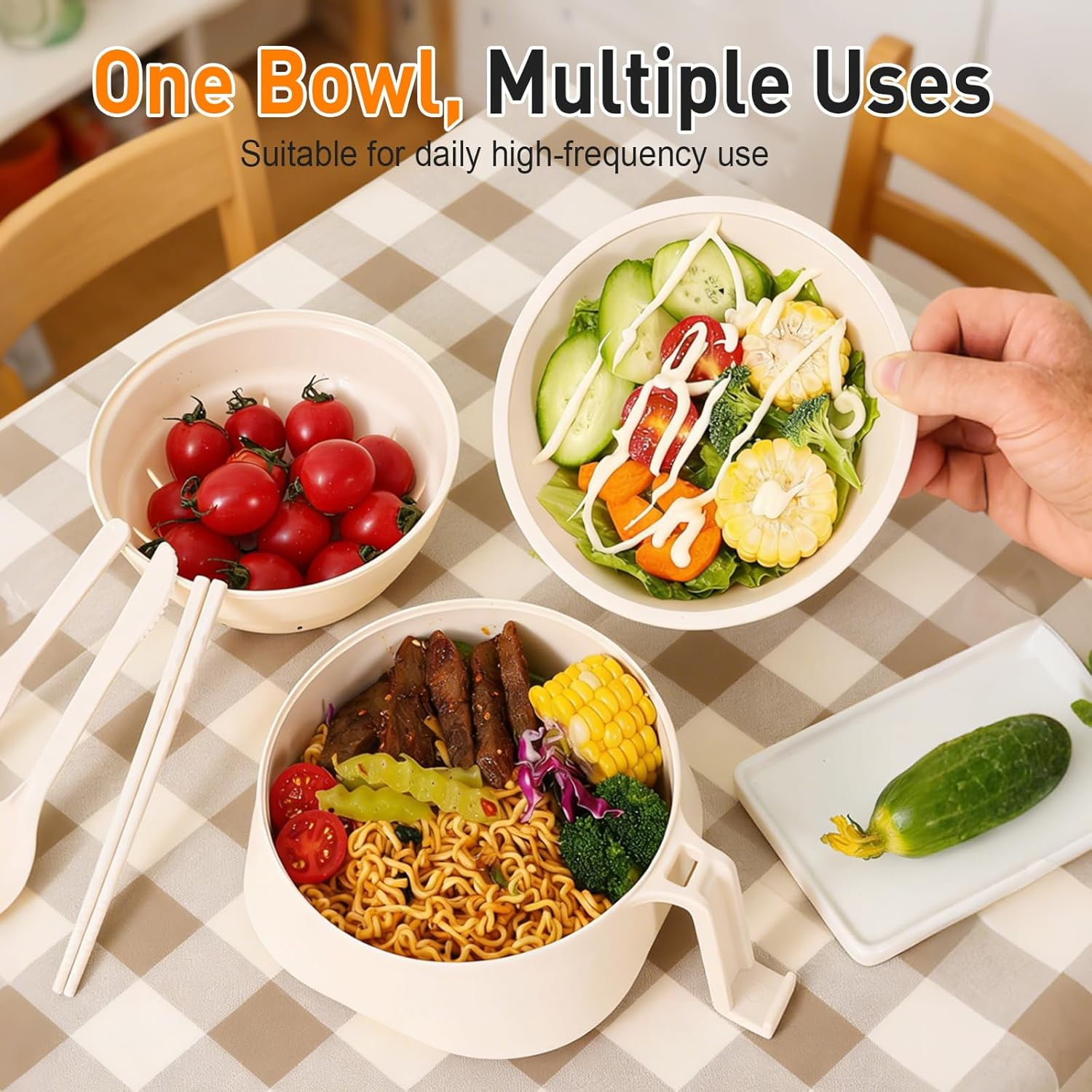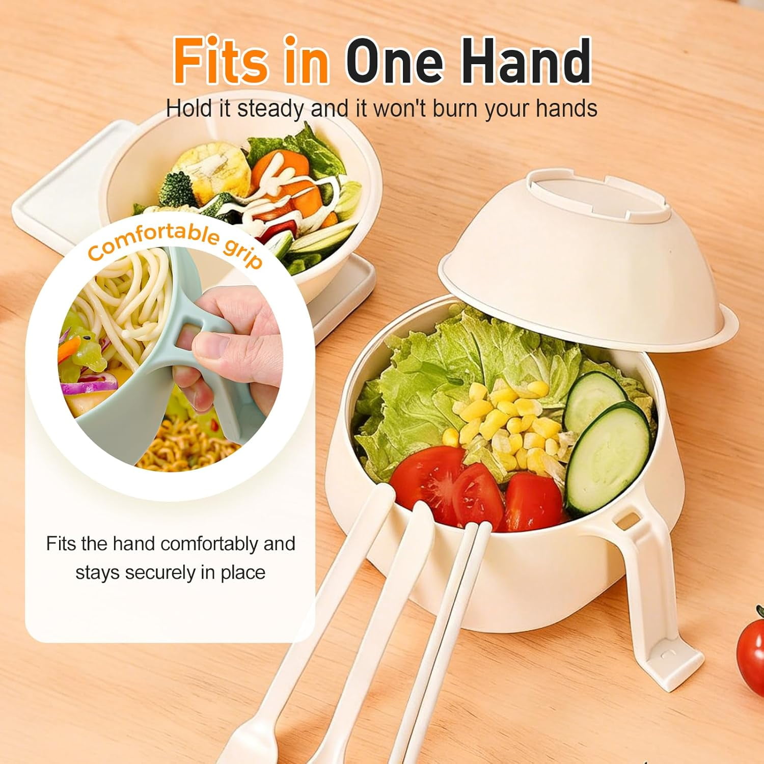 🎁【All-in-One Microwave Noodle Cooker】This set includes a large microwave-safe bowl with a built-in straining basket and a lid. Cook, strain, and eat your ramen or pasta all in one convenient container, directly from the microwave. 🎁【Heat-Resistant Handle & Phone Stand】The side handle stays cool for safe removal from the microwave. It also cleverly doubles as a stand for your phone or tablet, perfect for watching videos while you eat. 🎁【Made from Safe, Durable Materials】Constructed from food-grade, BPA-free materials like wheat straw and PP plastic. It’s microwave-safe, odor-resistant, lightweight, and designed for everyday use. 🎁【Perfect for Small Spaces & Fast Meals】Ideal for apartments, dorm rooms, offices, or travel. Its compact design saves space and makes preparing instant noodles, soups, or oatmeal quick and effortless. 🎁【Easy to Clean & Complete Set】The set includes the bowl, straining basket, lid, and chopsticks. All parts are easy to clean and nest together for compact storage.
