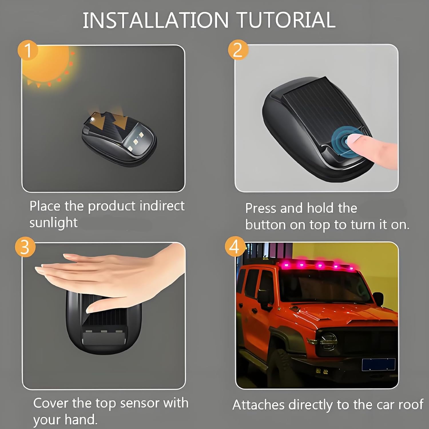 🎁【Easy No-Drill Installation】Features a simple peel-and-stick adhesive mount that fits most pickup trucks and SUVs. Install in minutes without any drilling, wiring, or damage to your vehicle. 🎁【Solar Powered & Energy Efficient】Equipped with a built-in solar panel for automatic daytime charging. Provides eco-friendly, self-sustaining power for reliable lighting without needing external electricity. 🎁【Smart Vibration & Light Sensor】Automatically activates and flashes when the vehicle is in motion at night. The light sensor ensures it only turns on in dark conditions and switches off after 20 seconds when parked. 🎁【8-Color LED Modes with Remote】Choose from 8 vibrant colors and multiple lighting modes (steady, flashing, fading) via the included wireless remote. Perfect for creating ambiance or enhancing visibility as a safety beacon. 🎁【Waterproof & Durable for Outdoor Use】Rated IP67 waterproof, making it suitable for all weather conditions. Ideal for camping, off-roading, nighttime repairs, or as an emergency signaling light.