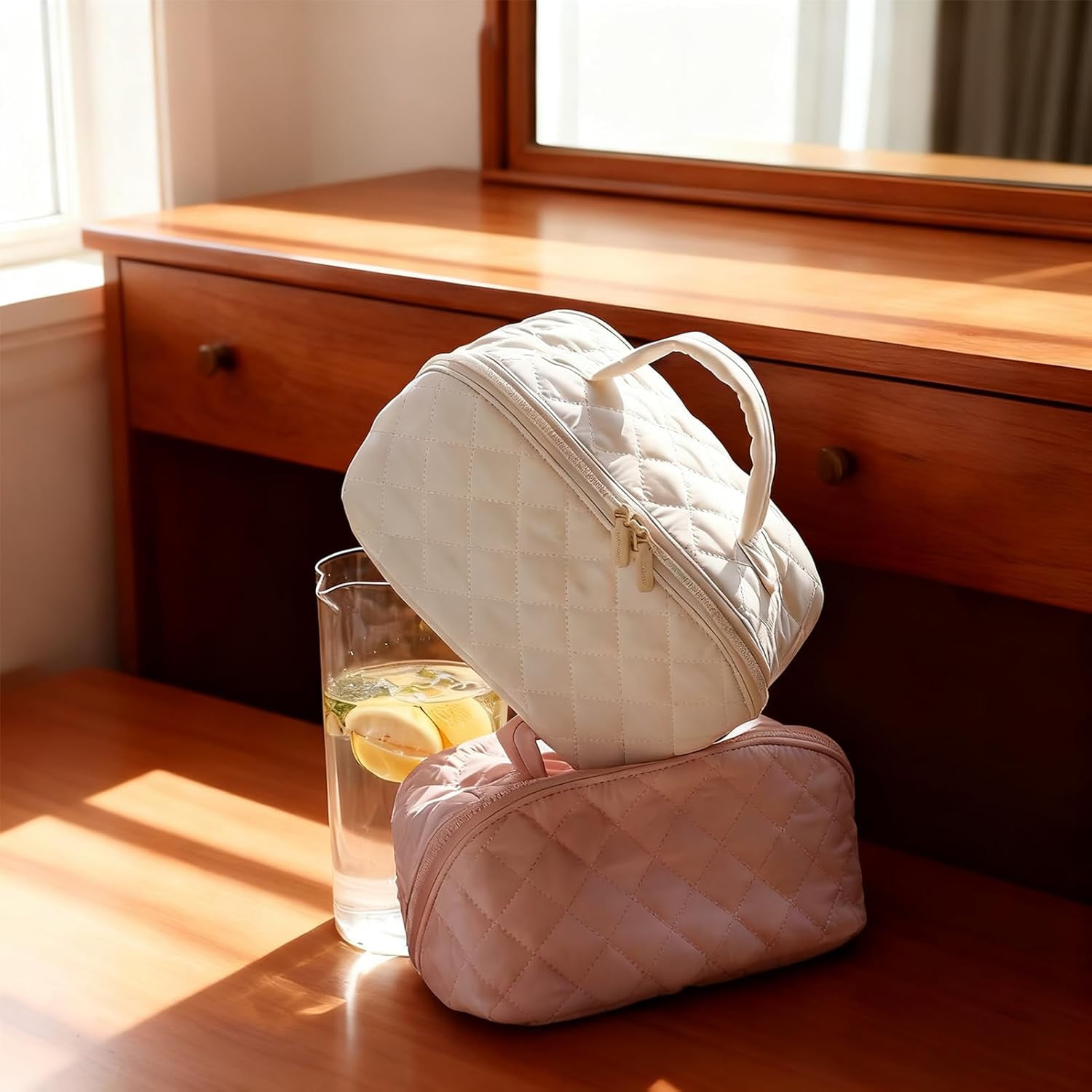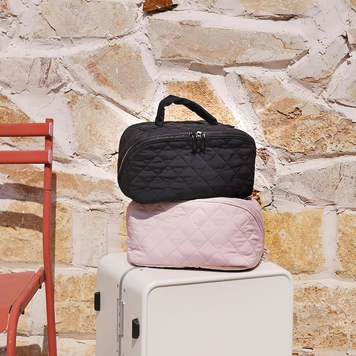 🎁【180° Lay-Flat Access】Opens completely flat for instant visibility of all cosmetics. Saves time with no digging through cluttered compartments while on the go. 🎁【5 Dedicated Organizer Pockets】Features five tailored compartments for full-size bottles, palettes, brushes, and toiletries. Keeps essentials neatly organized and mess-free. 🎁【Water-Resistant & Durable Build】Made from premium waterproof nylon with a protective lining. Resists leaks, stains, and scratches for reliable, long-lasting travel use. 🎁【Lightweight 2-Piece Set】Includes a large organizer and a compact pouch, both lightweight with a handy handle. Ideal for vacations or daily touch-ups and easy to carry. 🎁【Chic & Gift-Ready Design】Available in five stylish checkered colors, blending function with fashion. A perfect gift for moms, sisters, or friends on special occasions.